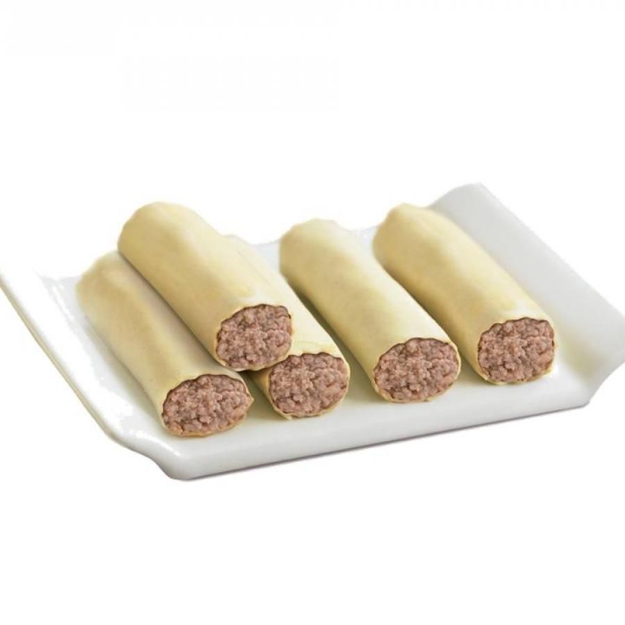 Canelons de carn sense beixamel, de 42 g cadascun, elaborats amb un farcit de carn de vedella, porc i au, tomàquet, ceba, una mica de nou moscada i pebre. Presentats per poder-hi afegir la salsa i l’acabat al vostre gust, són ideals com a primer o segon plat.