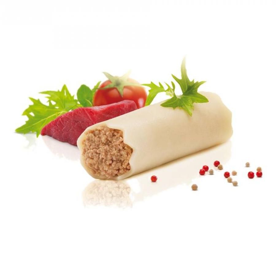 Canelons de carn sense beixamel d’alta qualitat. De 50 g cadascun, estan elaborats seguint el nostre mètode artesanal. Fets amb fines làmines de pasta ”al dente” i un farcit de carn de vedella, au i porc, més del 70% del producte és matèria noble. Presentats en format granel, els podeu acabar amb qualsevol salsa al vostre gust. Una opció versàtil i molt combinable. Ideals com a primer o segon plat.