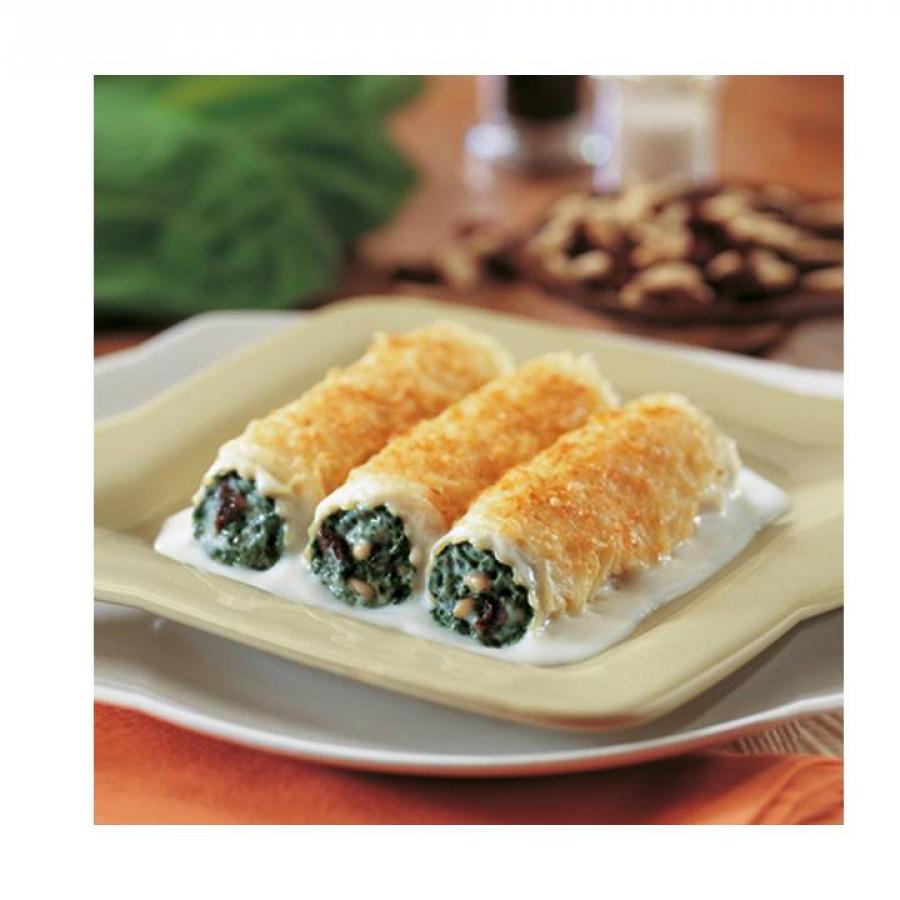 Deliciosos canelons amb beixamel ideals per als amants dels espinacs. Farcits amb un 18% d’espinacs de gran qualitat, panses de Corint i pinyons, i un toc de nou moscada i pebre, estan banyats amb una saborosa i cremosa beixamel. Acabats amb formatge fos, són una excel·lent opció com a primer o segon plat