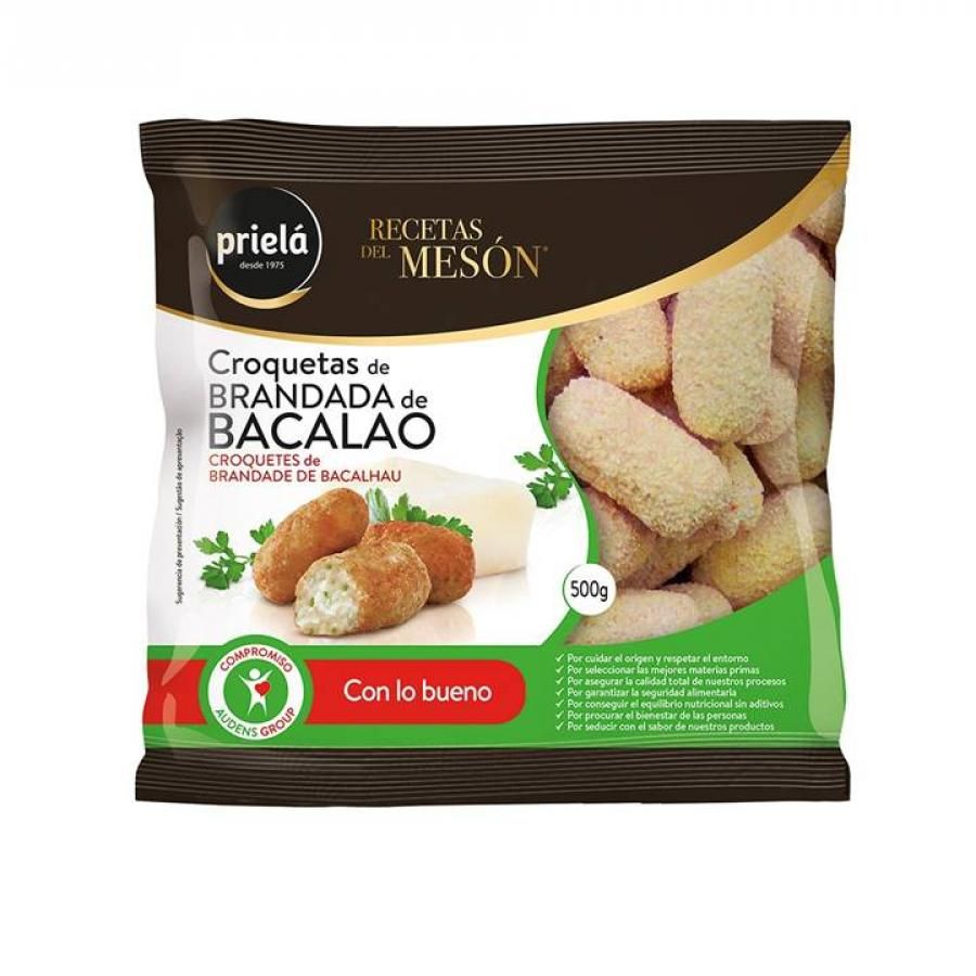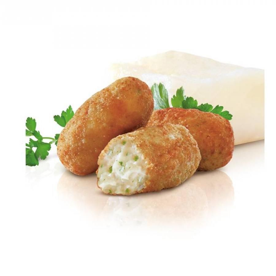 Delicioses croquetes farcides de brandada de bacallà. Amb més d'un 30% de bacallà al seu farcit i una mica de julivert, nou moscada i pebre, la nostra encobreix és única per la seva composició. Amb una forma irregular i artesanal, estan acabades amb un fi arrebossat exterior de textura cruixent. Ideals com a entrant o guarnició.