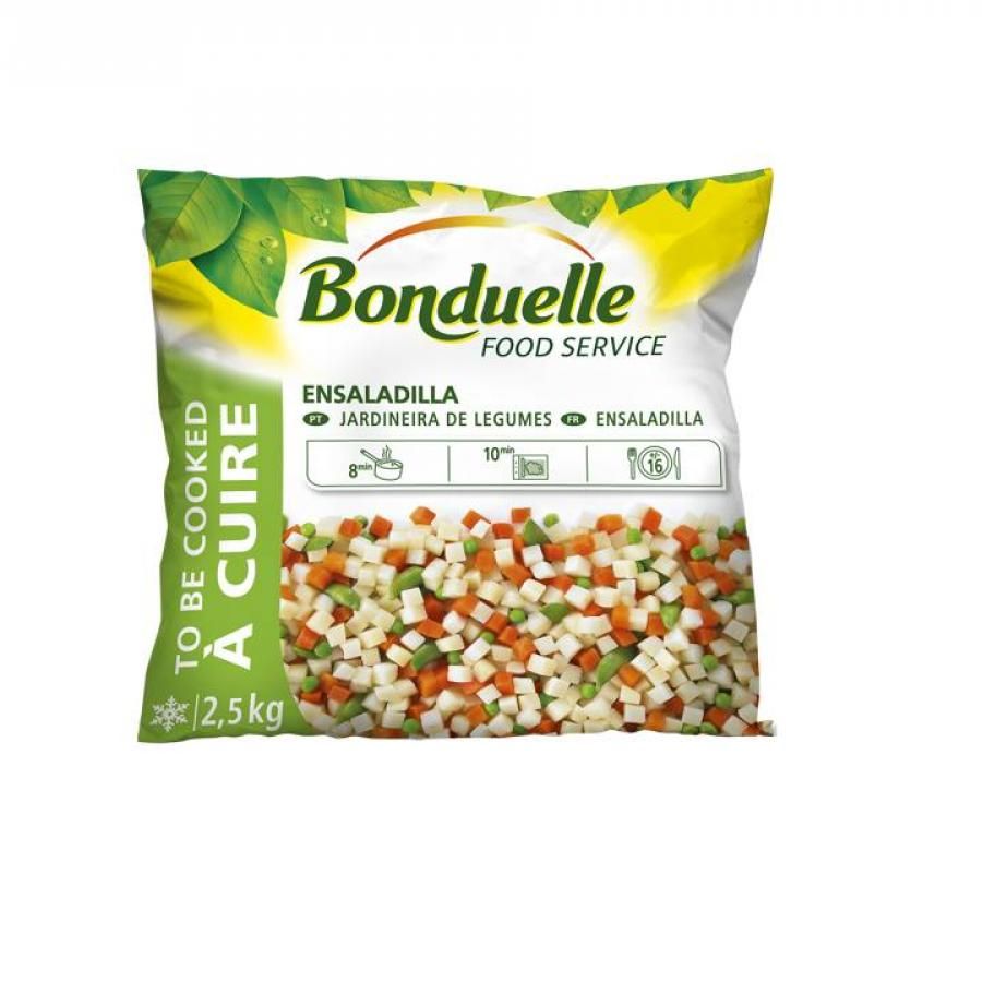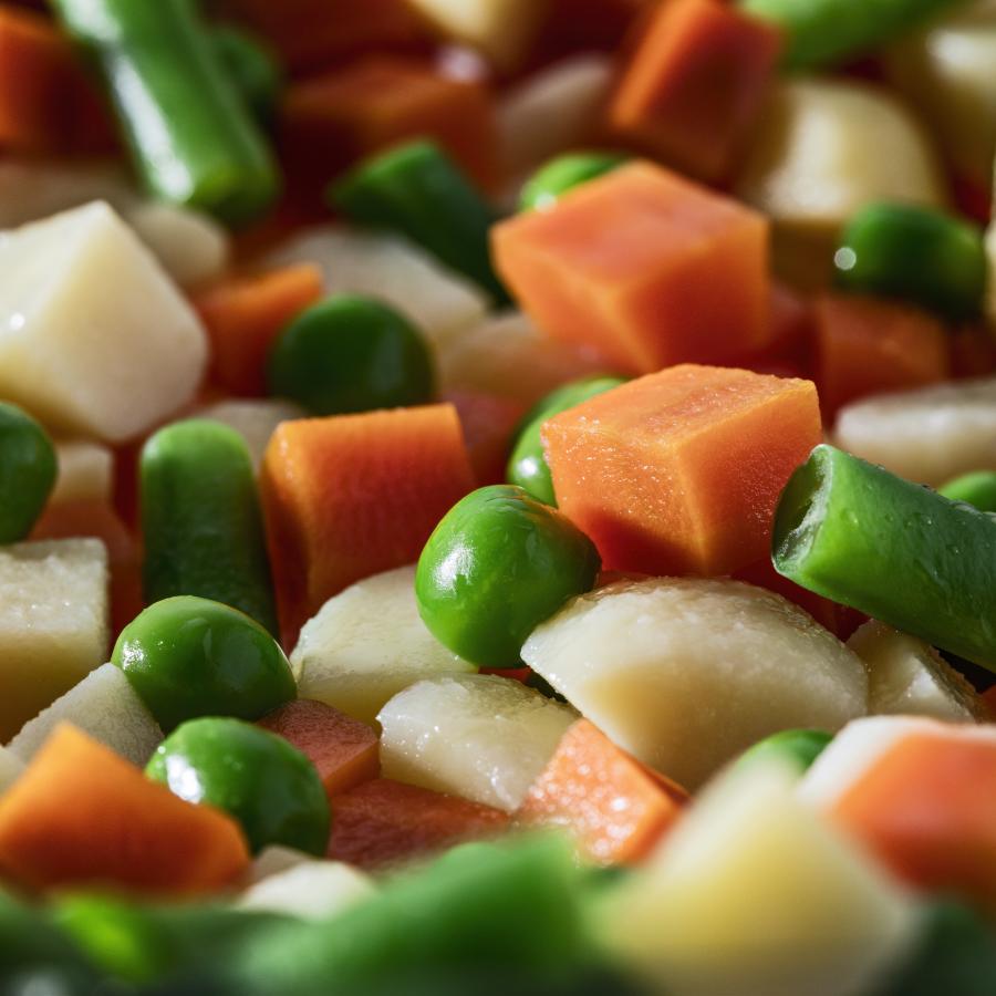 Mescla de verdures: patates (estabilizant: E450), pastanagues, pèsols, fesols tendres. Presència fortuïta d'api.