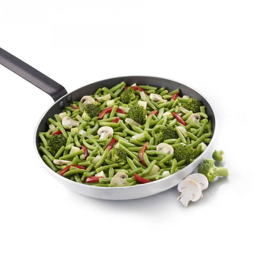 Mongetes tendres, bròquil (27%), ceba, xampinyons (12%), pebrots vermells. Presència fortuïta d'api.